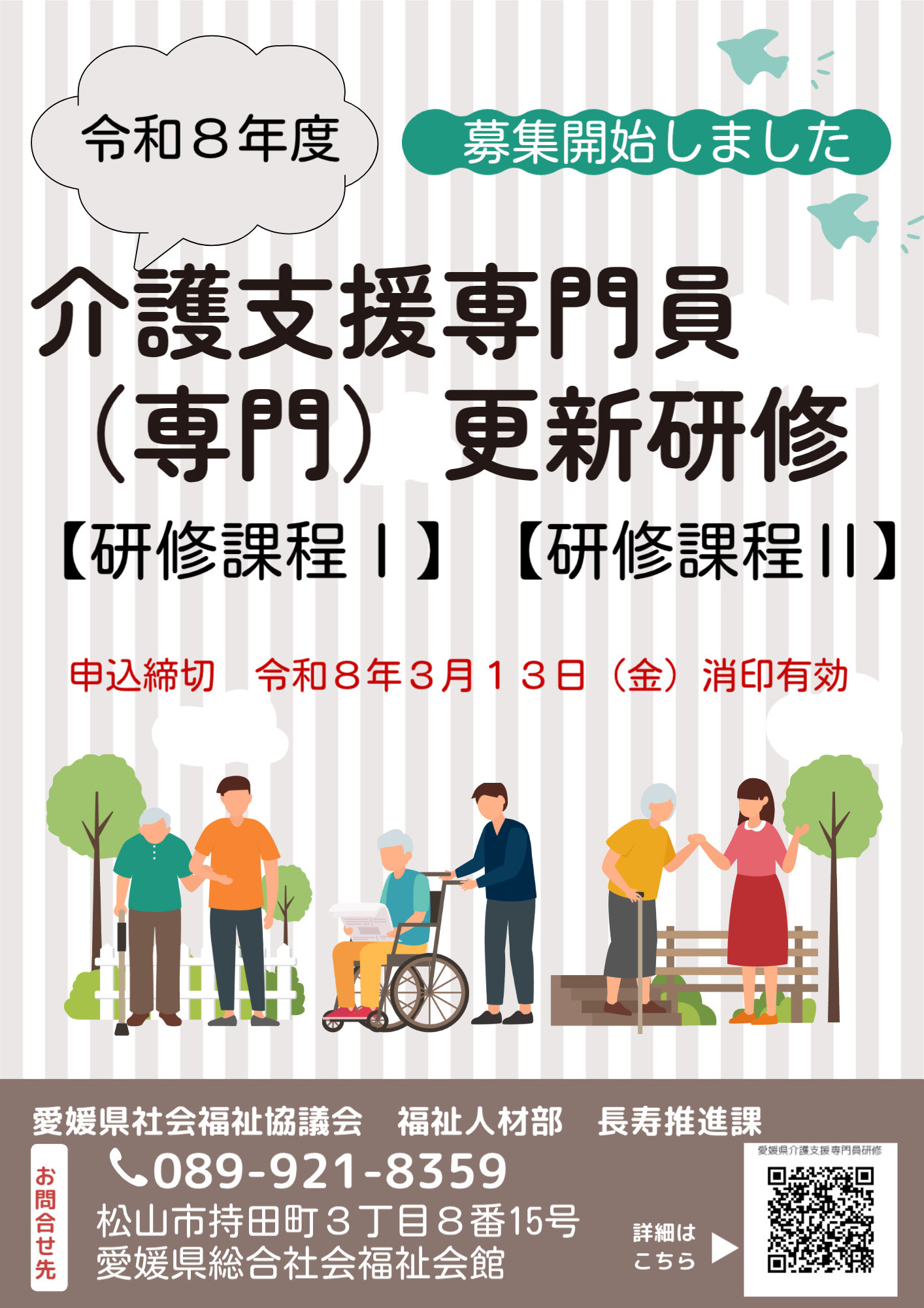 愛媛県社会福祉協議会 福祉人材部 長寿推進課からの令和8年度 介護支援専門員(専門)更新研修【研修課程Ⅰ】【研修課程Ⅱ】開催のお知らせを掲載しました。