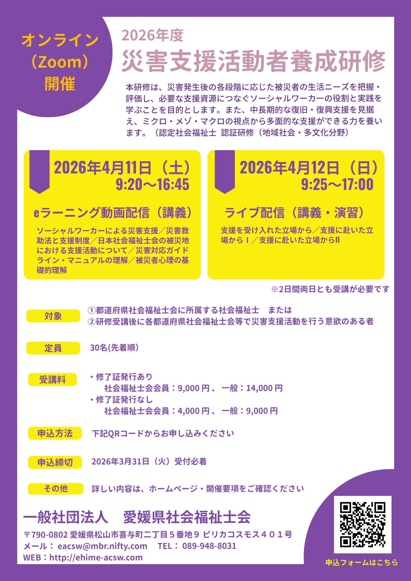 一般社団法人 愛媛県社会福祉士会からの「2026年度 災害支援活動者養成研修」開催のお知らせを掲載しました。